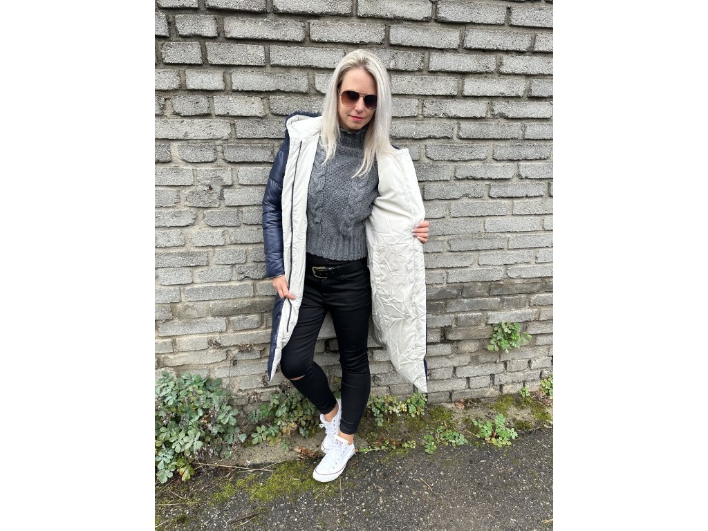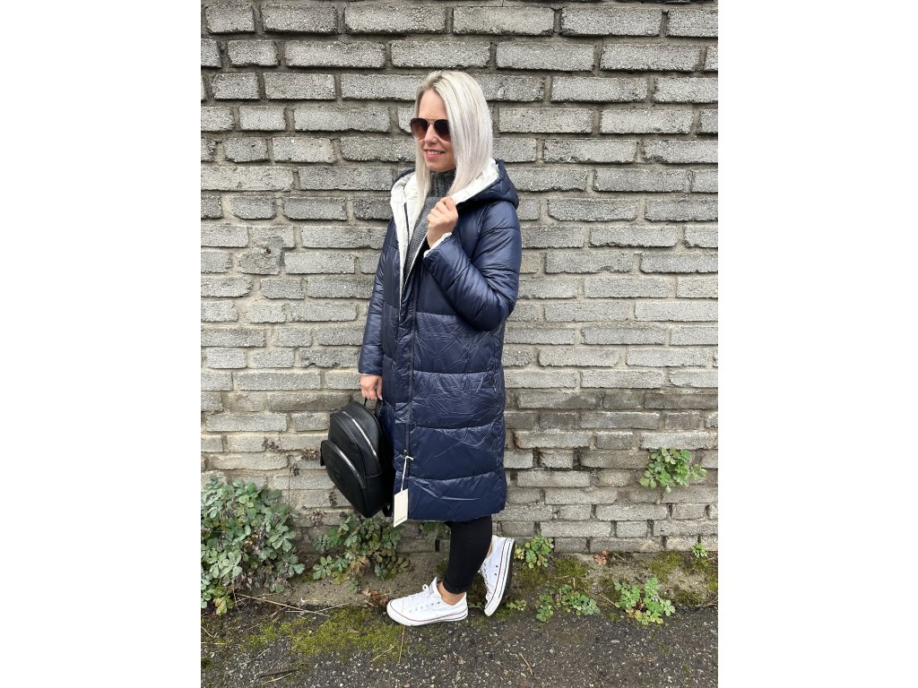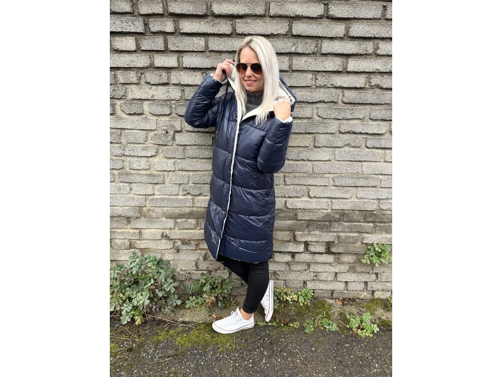 - oboustranný prošívaný kabát s kapucí, áčkového střihu
