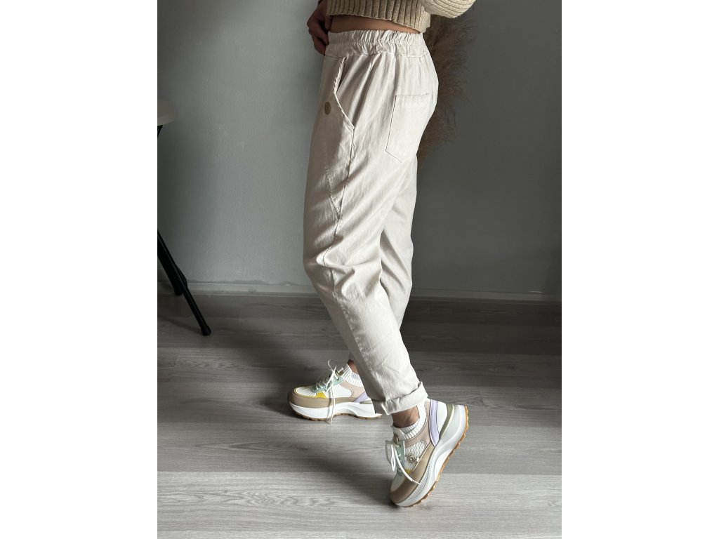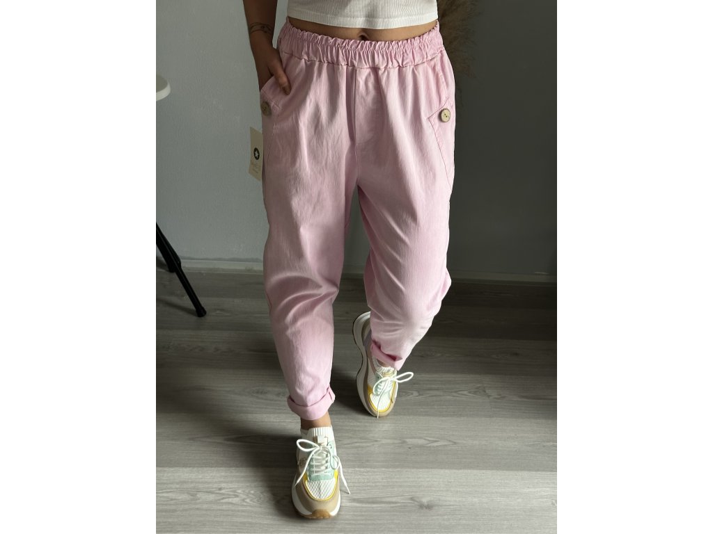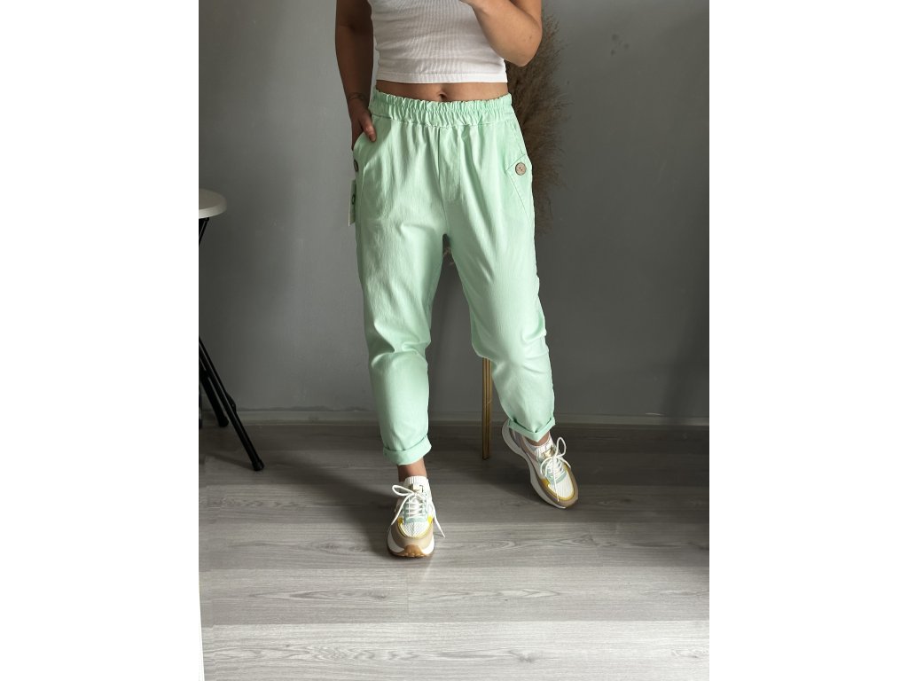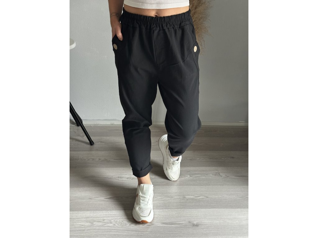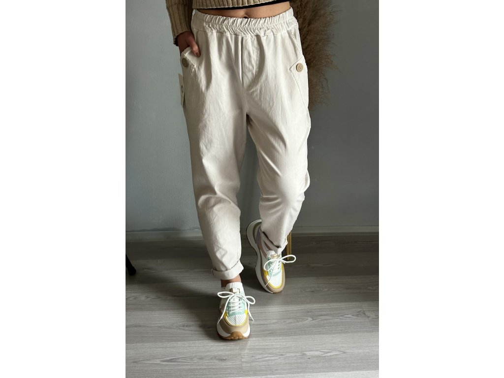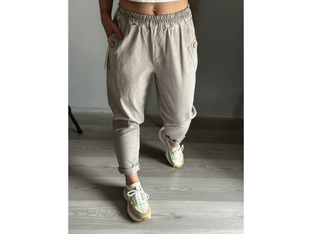 - oblíbené plátěné, pružné kalhoty, ozdobný knoflík na kapsách