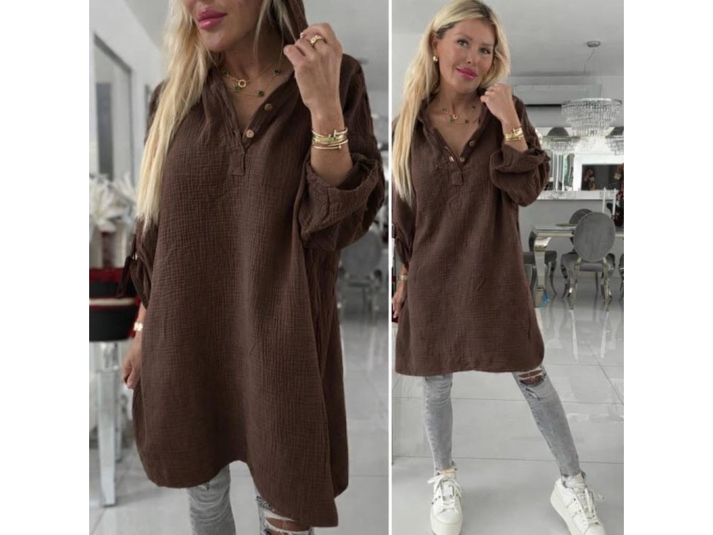 - mušelínová, dlouhá košile s kapucí, vzadu krátký rozparek, střih do A