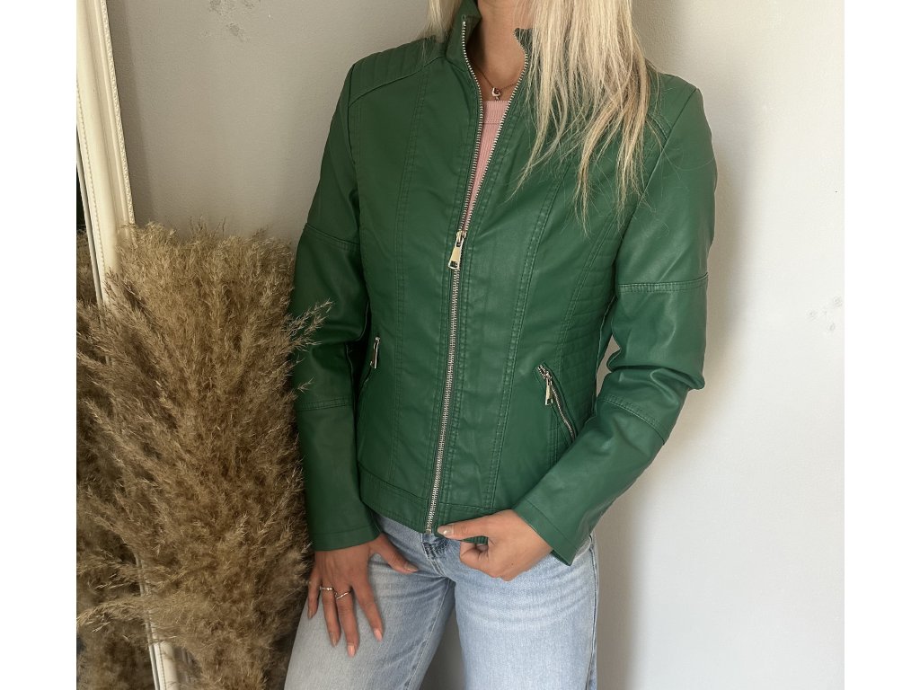 - tmavě zelená koženková bunda do pasu, kapsy na zip, vypasovaná