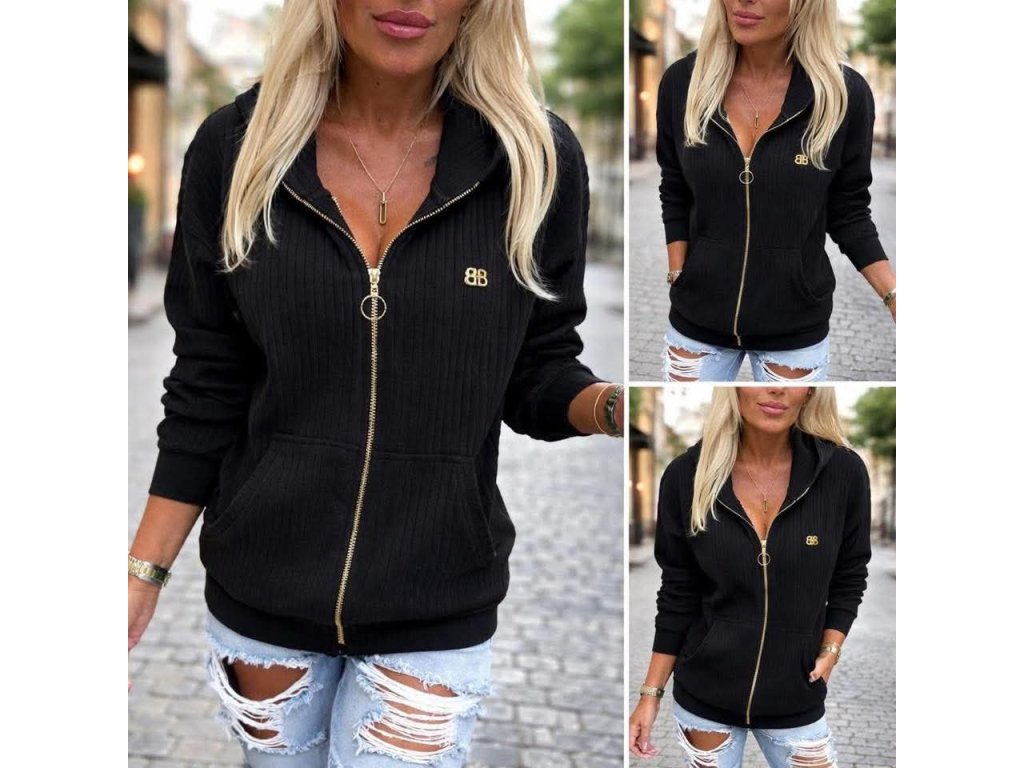 - oversize, žebrovaná mikina na zip, kapsy zepředu, malé zlaté logo