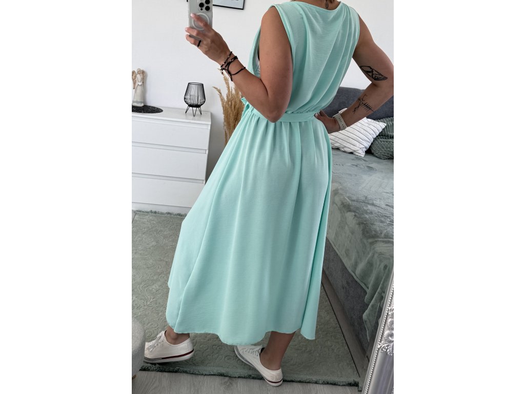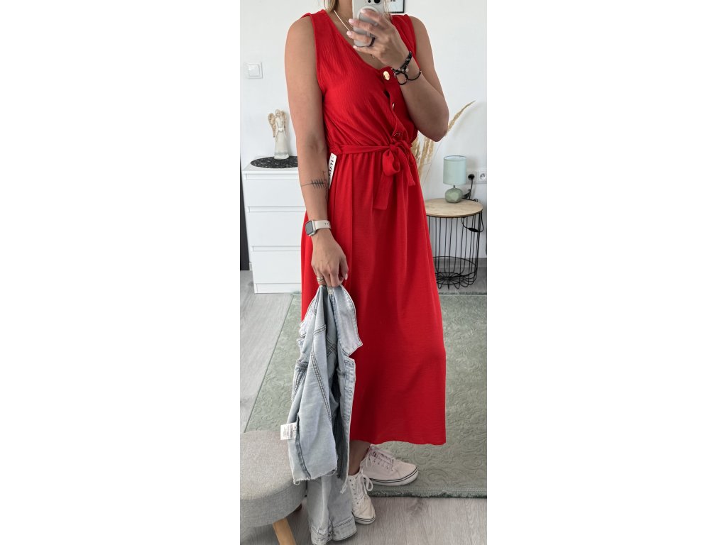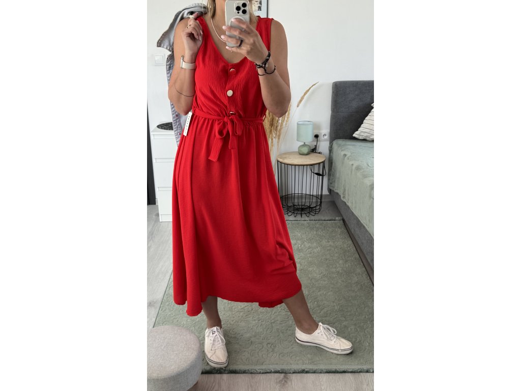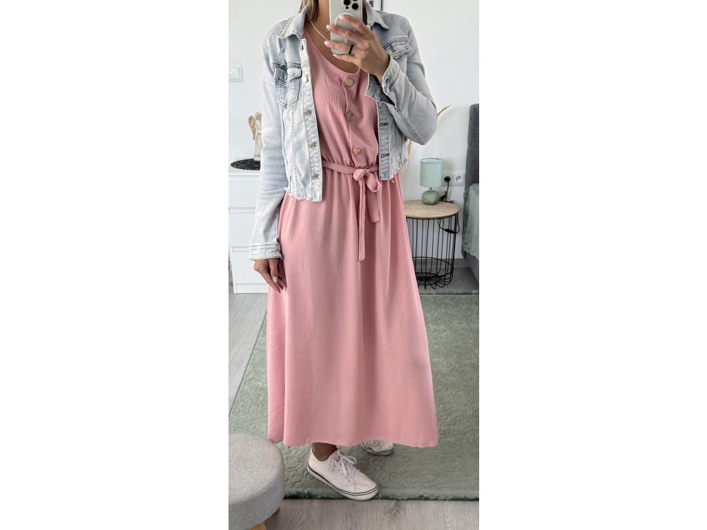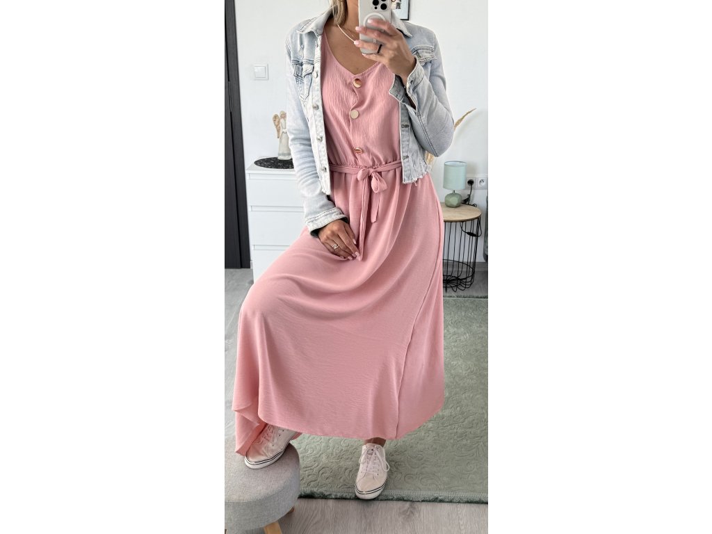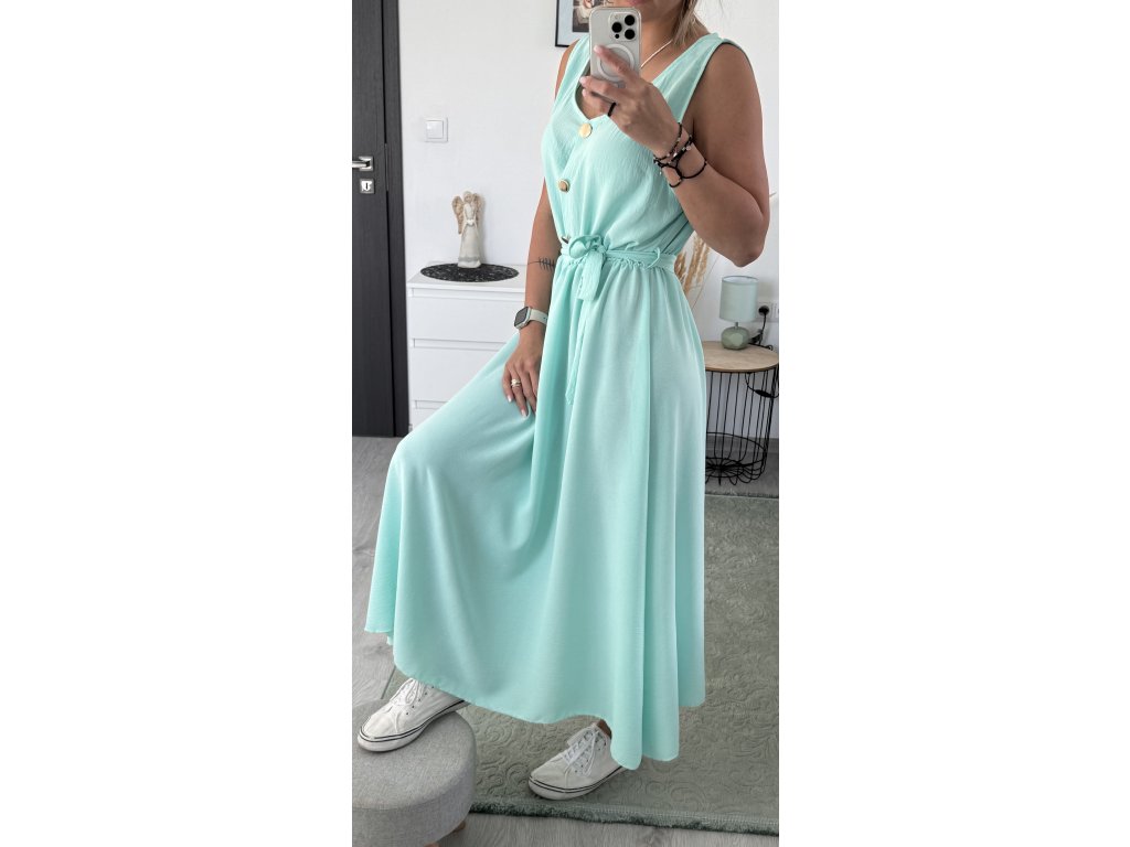 - dlouhé šaty bez rukávů, výstřih na knoflíky, v pase gumička a pásek v barvě šatů