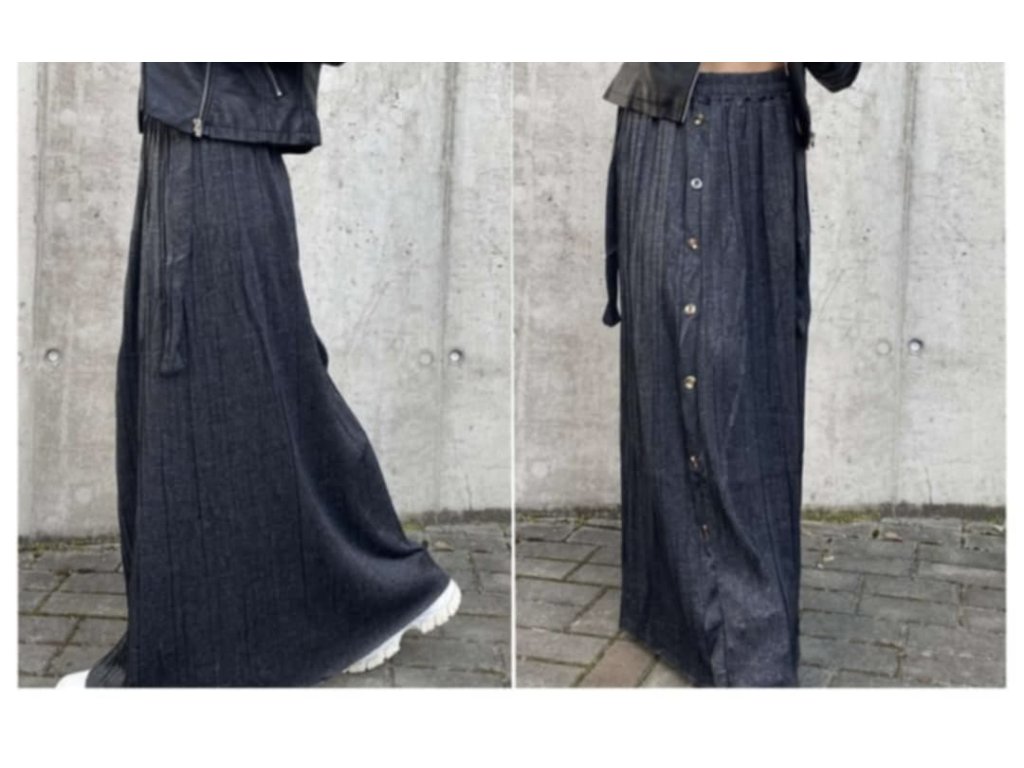 - dlouhá, skládaná sukně s falešnými knoflíky, v pase pružná guma, na zavázání