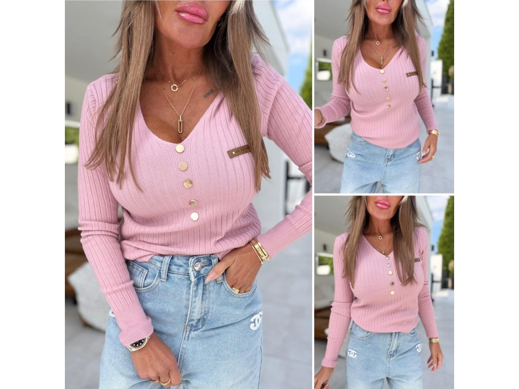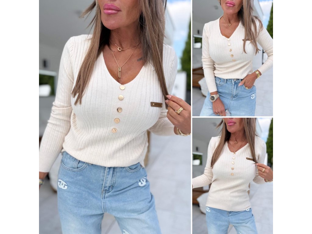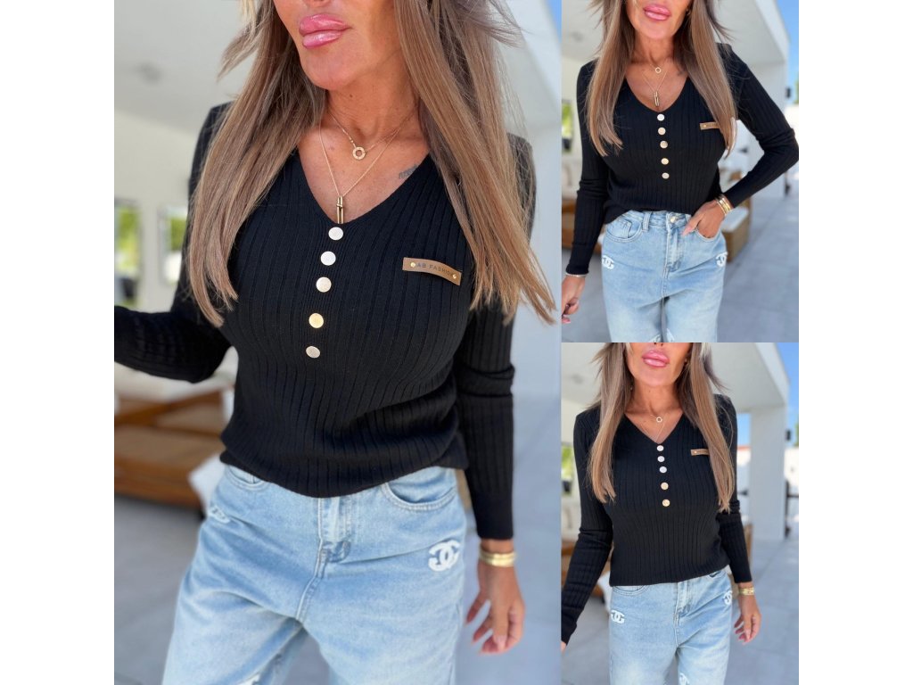 - elastický svetřík s výstřihem do V, ozdobený zlatými knoflíky, žebrovaný