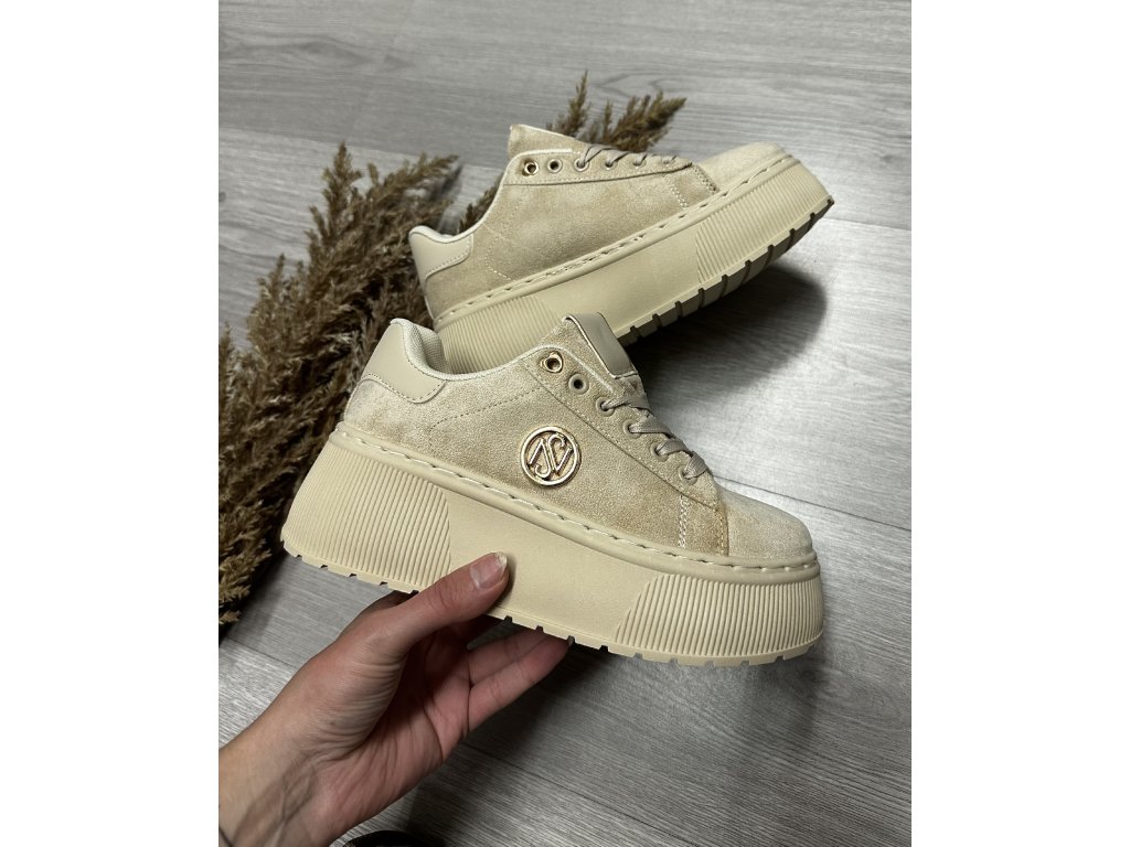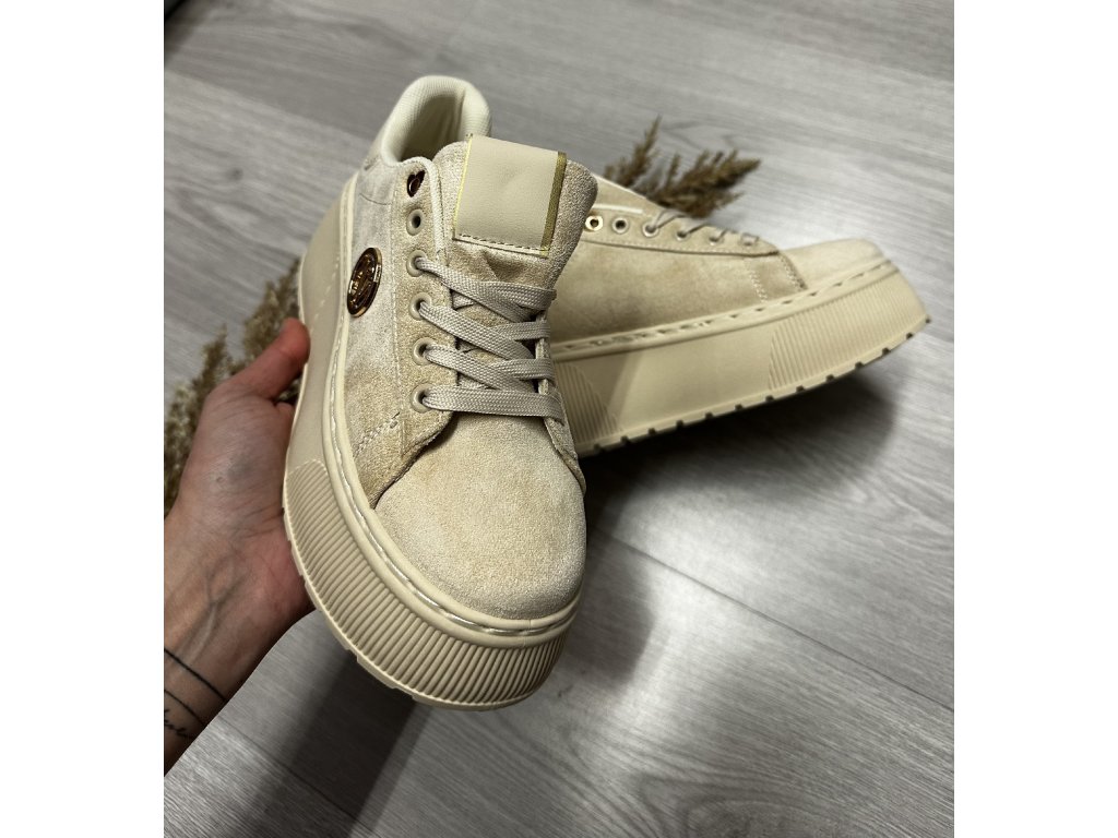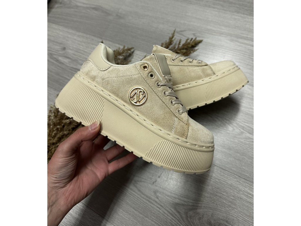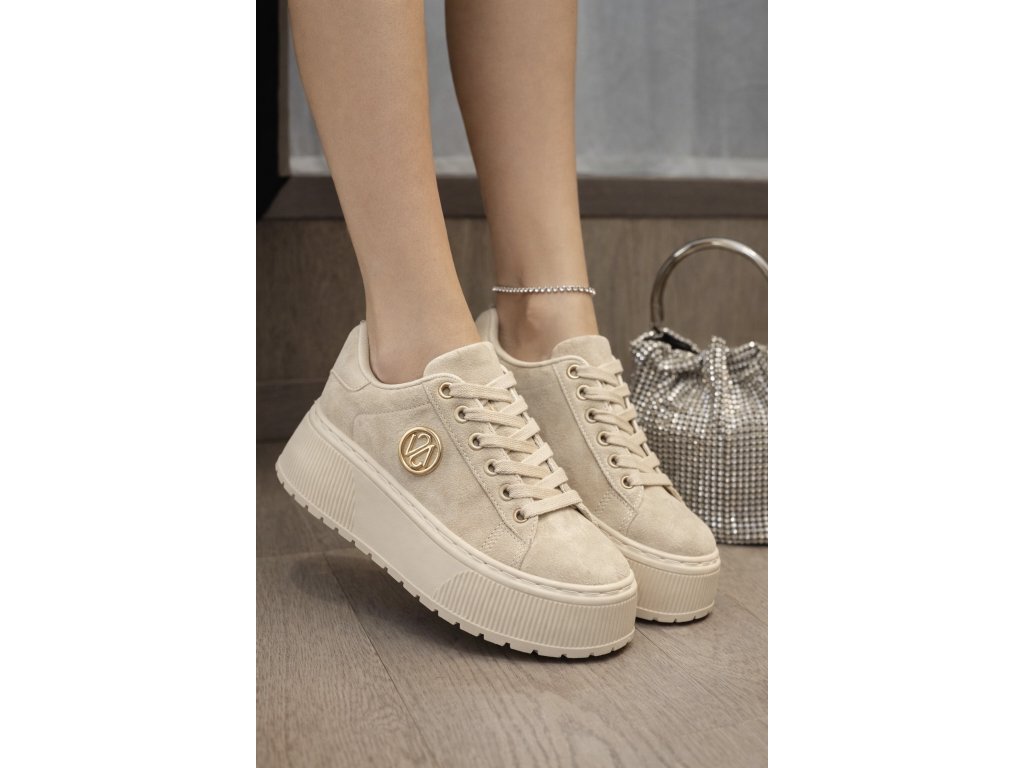 - semišové béžové tenisky na vysoké platformě, z boku zlatá aplikace