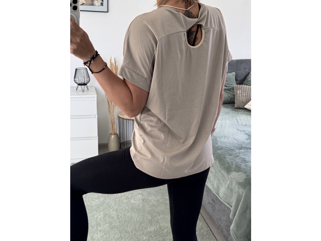 - oversize triko s nápisem, vzadu za krkem překřížené