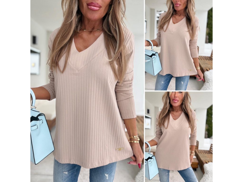 - žebrované triko s dlouhým rukávem, výstřih do V